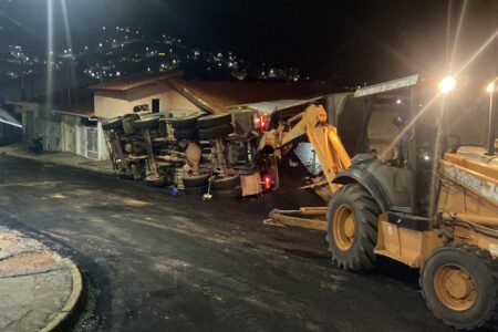 Caminhão basculante tomba durante obra de asfaltamento na Vila Esperança e atinge muro de residência