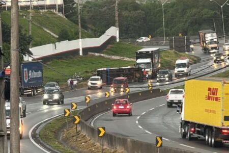 Micro-ônibus derrapa na Rodovia Fernão Dias e tomba na curva da Frum, em Extrema
