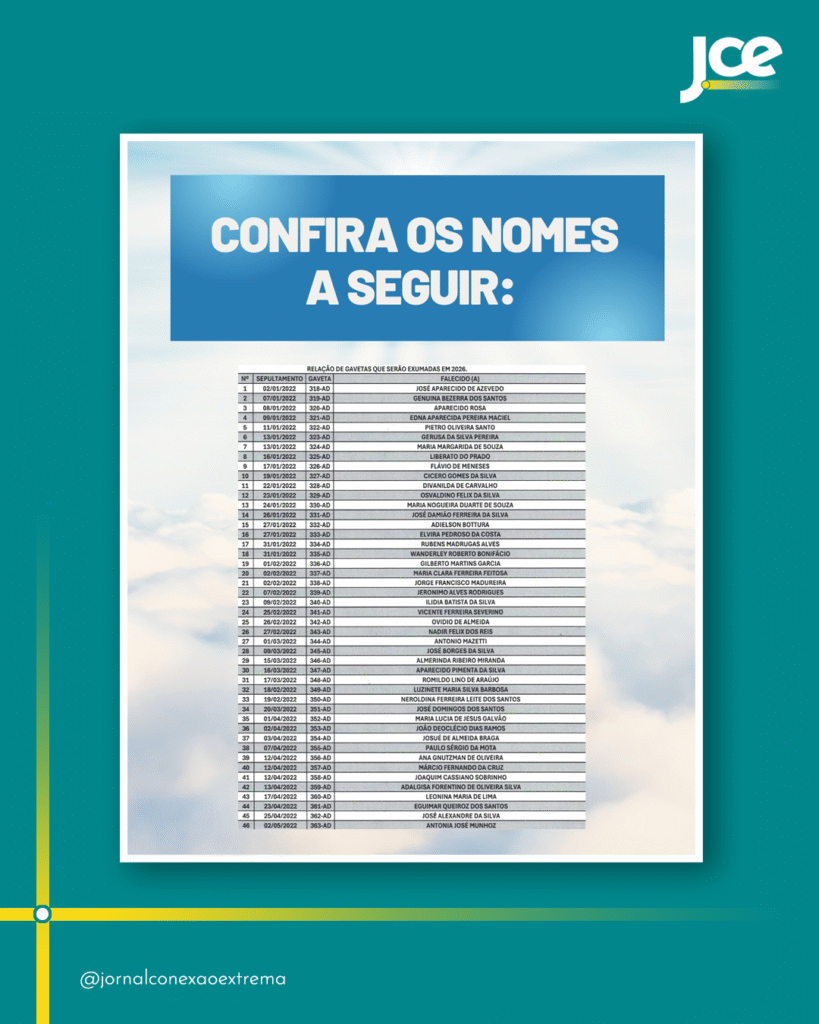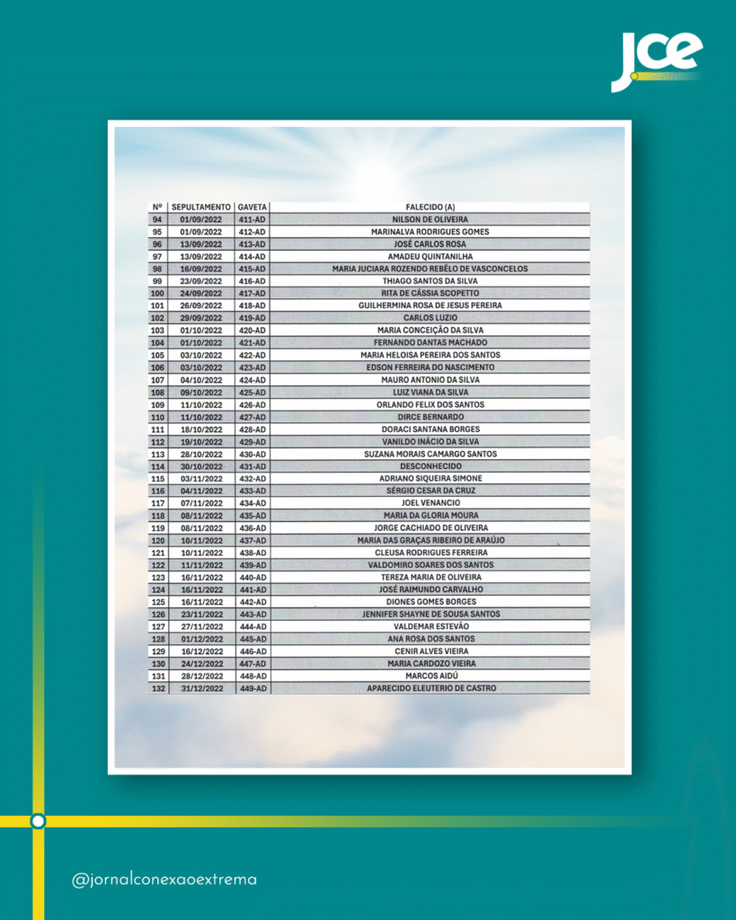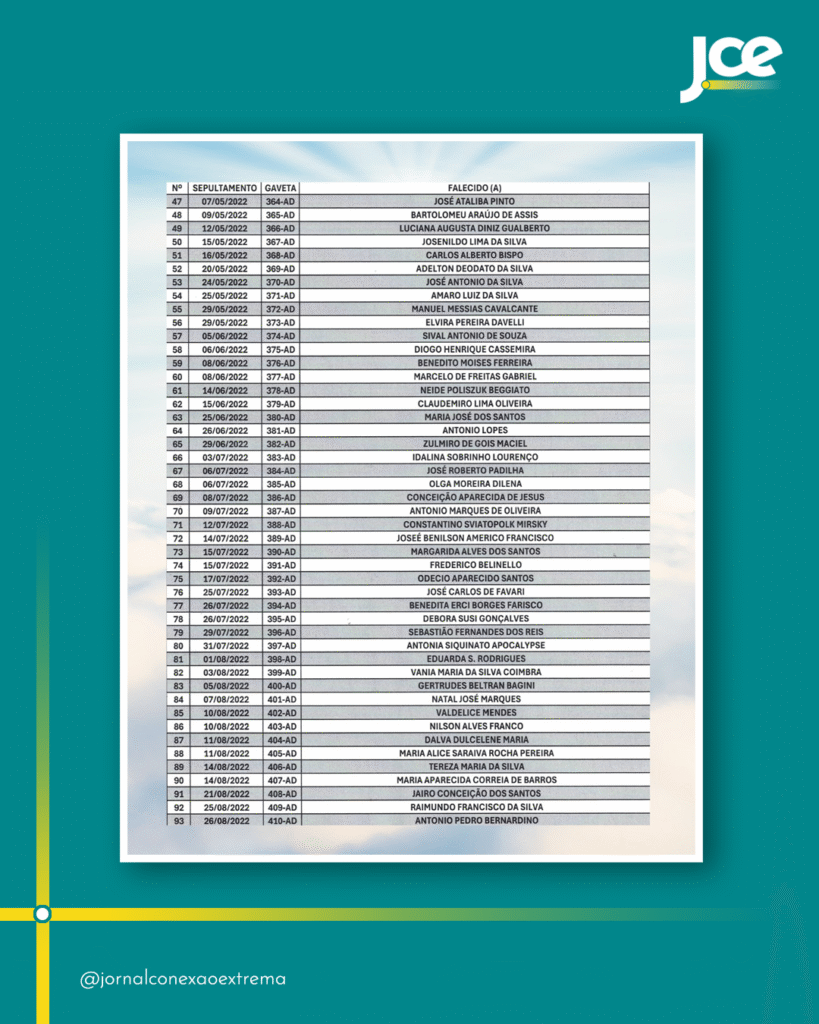 O setor administrativo do Cemitério Municipal de Extrema divulgou a lista com os nomes das pessoas que foram sepultadas em gavetas públicas, entre janeiro e dezembro de 2022, cujos restos mortais serão exumados e transferidos para ossuários municipais, em cumprimento ao cronograma de rotatividade, que prevê um ciclo de exumação entre quatro e cinco anos.