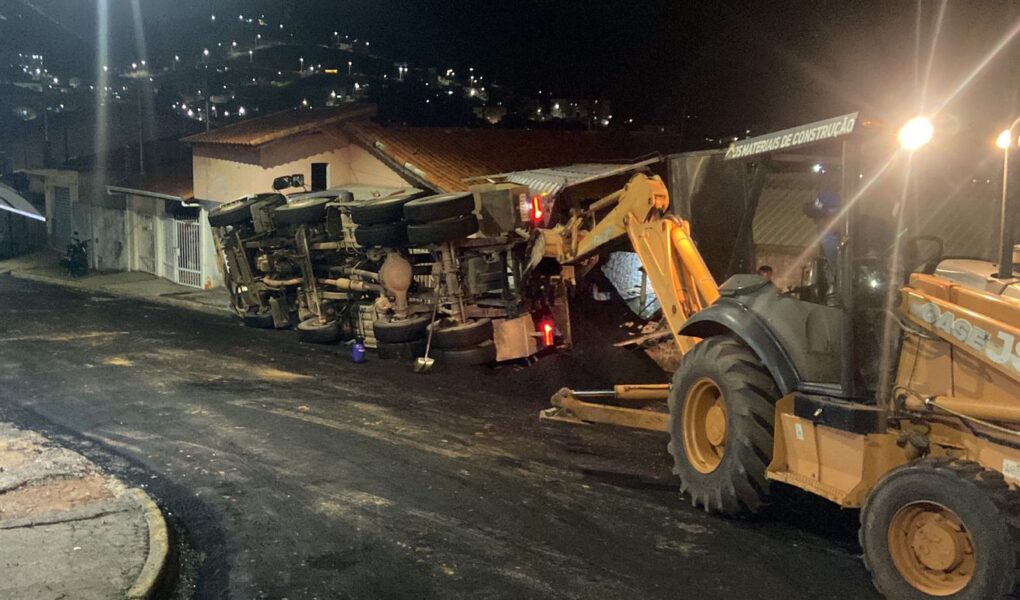 O acidente ocorreu por volta das 18h30, durante o serviço de retirada de material asfáltico, quando, por motivos ainda desconhecidos, o veículo tombou e a caçamba acabou atingindo a estrutura de uma residência, destruindo o muro e parte da cobertura do quintal.