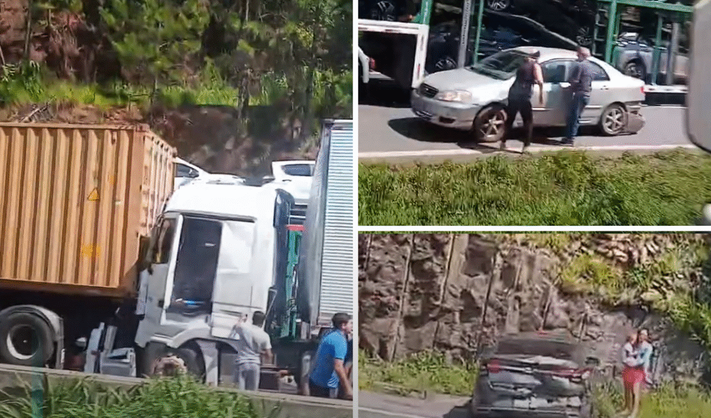 Na manhã desta quarta-feira (14), por volta das 10h30, um engavetamento envolvendo duas carretas, dois automóveis e uma van foi registrado na altura do km 946,1 da BR-381/MG, em Extrema, no sentido São Paulo (pista sul).