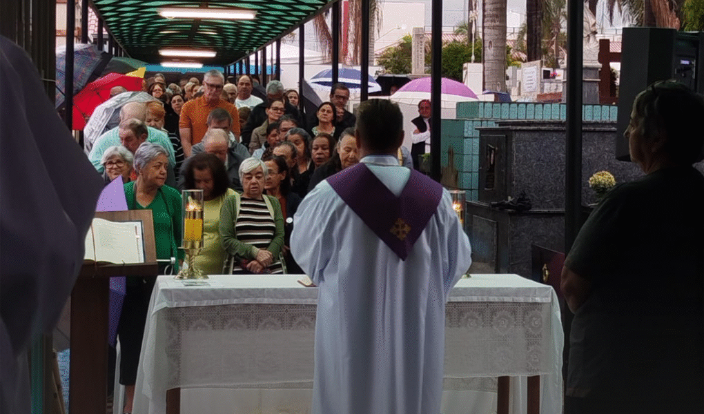 Logo nas primeiras horas da manhã, o pároco do Santuário Santa Rita de Cássia, Pe. Alexandre Acácio Nogueira, conduziu uma linda celebração em memória dos fiéis falecidos, em frente à capela do cemitério, reunindo cerca de 150 pessoas, que transformaram a dor da saudade em oração e clamor.