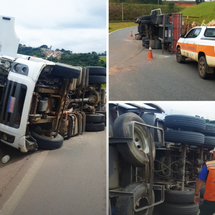 Carreta tomba após contornar rotatória no Trevo Sul de Extrema