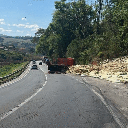 Carreta tomba e carga de madeira fica espalhada em pista da Rodovia Fernão Dias, em Extrema