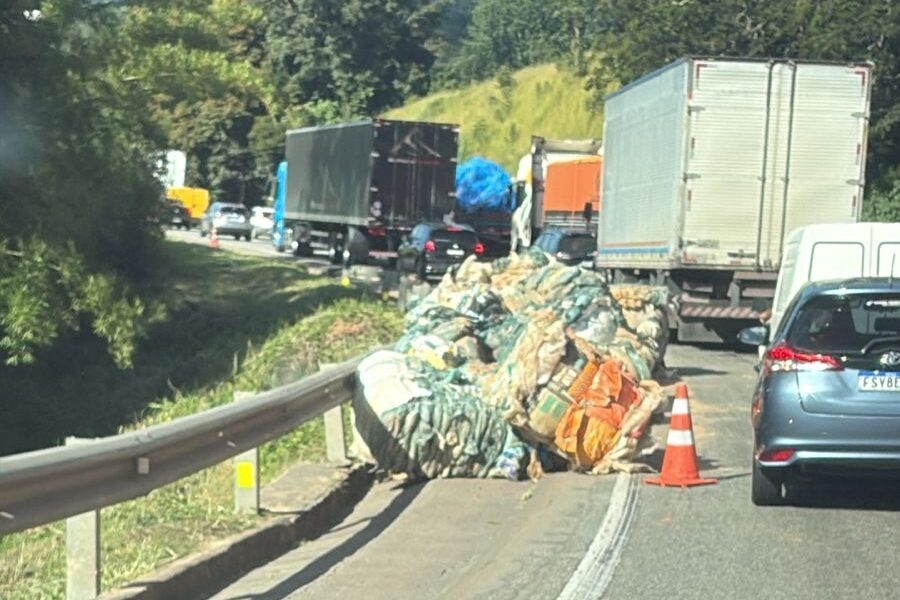 Equipes da concessionária Arteris Fernão Dias foram acionadas por volta das 14h49 para atender à ocorrência, que envolveu o derramamento de fardos de material reciclável na pista, com parte da carga também ficando espalhada pelo acostamento.