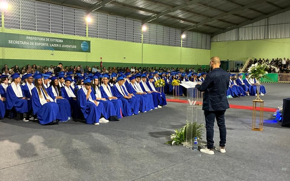 No último dia 9 de dezembro, a Escola Municipal Maristela Carniel Onisto celebrou a formatura de 140 estudantes das turmas dos 9º anos do Ensino Fundamental em uma emocionante cerimônia realizada na quadra externa do Ginásio Poliesportivo.